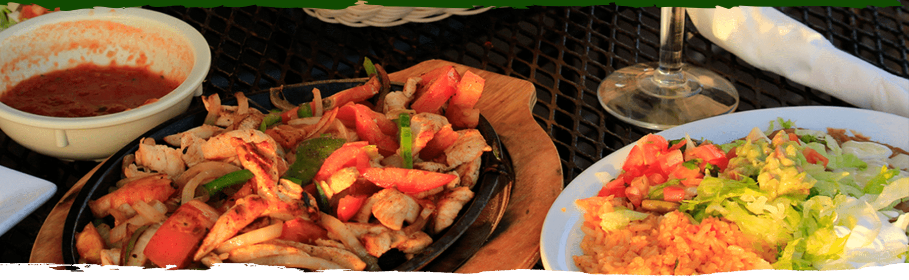 Two flour tortillas filled with grilled chicken or steak, onions, peppers, tomatoes. Covered with cheese dip. Served with rice, lettuce, guacamole, sour cream and tomatoes.